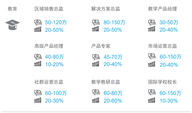 今年教育行业整体薪酬变化处于部分平稳、偏下降的趋势。部分赛道薪资降幅较大,线下各类职能薪酬呈现平稳中略有下调的趋势。与去年同期相比,在线K12、幼儿AI线上教育,主讲教研类、运营类、高级管理类等职位的降幅比较明显;教育信息化领域的产品、市场、销售类岗位薪酬涨幅较为显著。